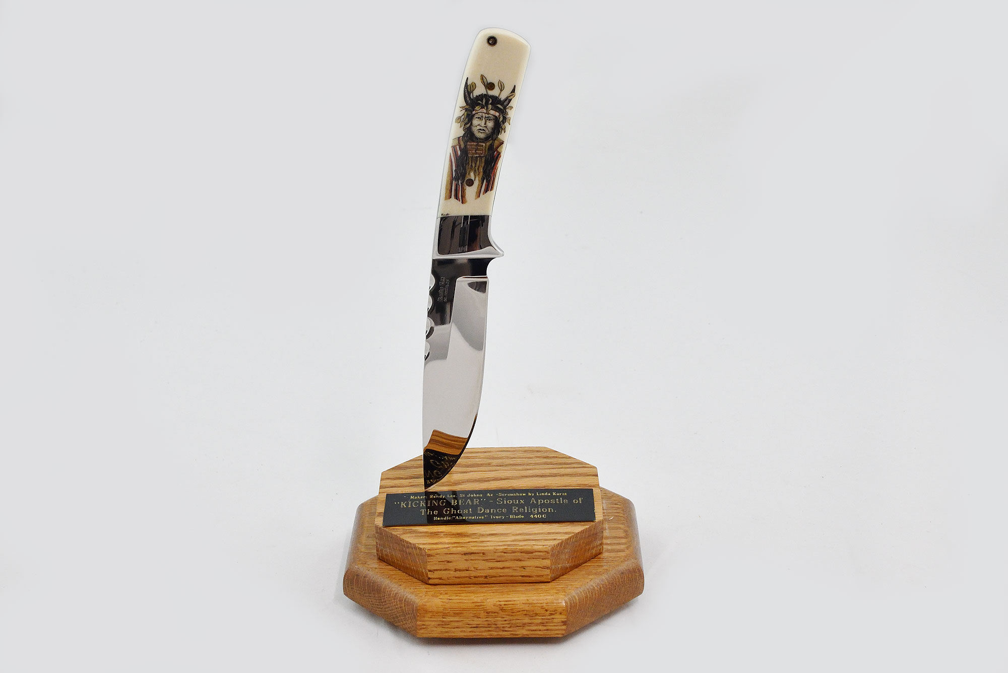 Handle: Alternative ivory with "Kicking Bear" scrimshaw by Linda Karst