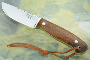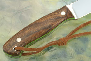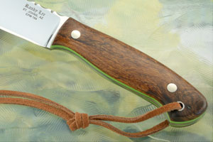 Handle scales are Arizona desert ironwood, secured to a full tang for strength and durability. Ironwood (Olneya tesota) is a rare wood that is only found in the valleys of the Sonoran Desert below 2,500 foot elevation. It is extremely dense and durable. In fact, it is so dense that if a piece is dropped in water it will sink! The contoured scales are extremely comfortable and provide excellent grip. Lime green liners add a nice touch of contrast to ironwood. A leather lanyard is included at the rear of the knife for extra retention in hand.