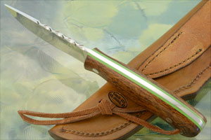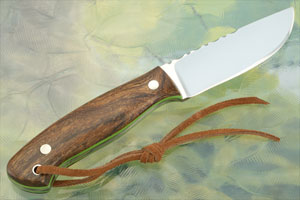 Description: Randy's fascination with knives began as a young man, when he made his first knife in a high school "metal" class. Since then, knifemaking has become a family project for him. Each of his four sons have taken their turn helping in the shop, while his wife, Sonja, makes the sheaths for the knives. This Ironwood Hunter is an excellent example of Randy's work.