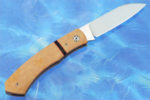 Handle scales are maple Richlite set on stainless steel liners. The liners are jewel polished in the interior. The polished stainless steel shield escutcheon is inlaid perfectly with no gaps. The scales are fit to matching maple Richlite bolsters. Red fiber liners add a touch of contrast to the light toned scales. Torx construction throughout allows the knife to be disassembled for cleaning or repairs.