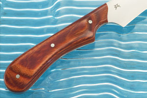 Rosewood Dymalux handle scales are set on a full tang for strength and durability. The scales are secured using nickel silver pins. Bamboo filework is filled with black epoxy. This knife utilizes a very deep choil (cut-out) for the forefinger to rest in. This offers several different grip options, and makes the knife easy to grasp - even with slippery or wet hands.