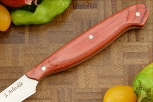 Description: Handmade by Jim Arbuckle, this 3-1/2 inch paring knife is an excellent choice for the chef that wants a knife that is as attractive as it is useful. This piece is handmade and one-of-a-kind - there's not another one like it in the world!