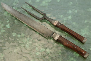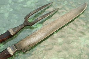 The fork and blade are matching heat colored damascus, forged from carbon steels to ensure excellent edge holding and chip resistance. The blade is a san mai, with the damascus surrounding a carbon steel core. Both the fork and blade culminate in integral carved bolsters. Handle scales are carved rosewood set with silver pins. They are surrounded by antiqued mokume gane spacers. The distal tapered full tangs are hand fileworked.