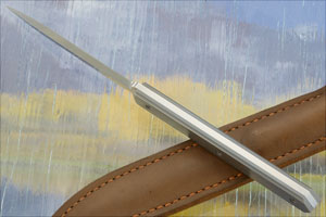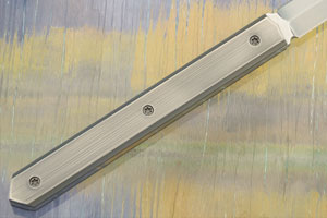 Textured titanium handle scales are set on the full tang using torx screws. This allows the scales to be removed in case repair or cleaning is needed. Titanium keeps the knife lightweight, but extremely strong.