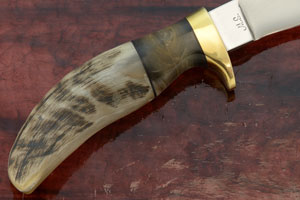The brass guard meets perfectly to the sheep horn handle. The natural texture of the sheep horn provides a sure, comfortable grip. This, combined with the distal taper and the way the handle comfortably fills the palm, means a capable knife that is built for hard work. Black G-10 spacers assist the knife to adjust to temperature and humidity changes.