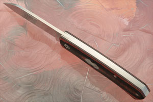 The blade is hand ground M390 premium stainless steel. M390 is a super-steel created by Bohler in Austria. It takes an incredibly sharp edge and holds onto it due to a high concentration of vanadium and chromium carbides. Its unique powder metallurgical process also promotes a uniform carbide distribution and clean steel properties, making M390 a popular steel used in surgical cutting instruments and in applications requiring a high finish. It offers excellent corrosion resistance due to its high concentration of chromium. The blade is hollow ground for an easy to maintain edge. It is well centered with a firm half stop -- easily opened with the right-handed thumb nick.