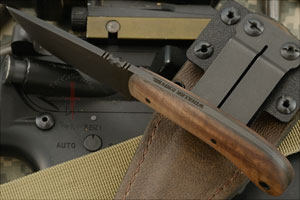 The blade is 3/16" 80CRV2 carbon steel with a non-glare Caswell finish. Premium walnut handle scales personally selected by Daniel Winkler are set on the distal tapered full tang, reducing overall weight. The handle is completed with a lanyard hole.