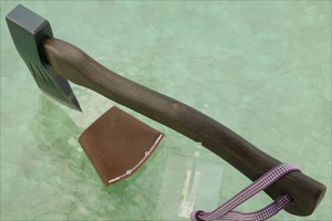 The head is hand forged in a three-layer laminated style called warikomi. A hard steel insert of .45% carbon steel (S45C) is set in the middle of the head. This is surrounded by two softer steel layers to support the cutting edge. The head features three grove on the left side and four on the right. This is a traditional mark in Japan to signify protection by the Yaoyorozu from accidents during dangerous mountain work. This Ko-Ono Hatchet is designed for chopping kindling and similar tasks.