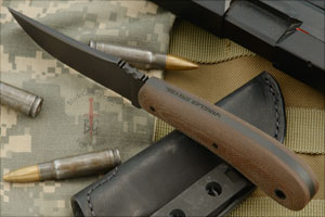 The blade is 80CrV2 carbon steel -- a steel that takes and holds an incredibly keen edge. A Caswell black oxide finish is both non-reflective and provides limited rust resistance. A skeletonized full tang means great balance. Jimping along the spine offers an easy thumb purchase.