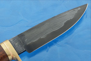 The handle is Arizona desert ironwood (Olneya tesota). The warm-toned wood has a nice mix of warm tones with dark figure moving through it. The handle provides a sure, non-slip grip. The handle is perfectly fit to a satin finished silicon bronze guard. A copper spacer brings out warm tones in the ironwood.