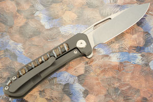 A glass bead blasted grade 5 titanium frame ensures this mid-size folder will be light in the pocket, yet have tremendous strength and durability. Each side features woolly mammoth molar inlay. The ancient tooth has a a nice mix of white, chocolate, and caramel tones. Screws throughout were made in the Arno Bernard workshop and are grade 4 titanium, allowing them to be anodized. Ensuring rigid, yet light construction, the backspacer is grade 5 titanium.