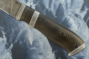 The handle is black linen Micarta. The pommel, guard, and spacer are matching damascus.