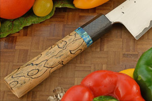 The ambidextrous Japanese-inspired half octagonal handle is faceted at the top and rounded at the base. This shape is among the most comfortable of traditional Japanese handle styles. The handle combines spalted tamarind with a carbon fiber bolster. A dyed mammoth molar spacer set between adds excellent contrast. This knife is perfectly balanced and will be a pleasure to use. Like other knives, this knife should not be put in the dishwasher.