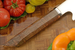 The handle is inspired by the Japanese ambidextrous octagonal handle and provides a comfortable grip. The handle is dyed and stabilized redwood burl which will hold up well to the demands of a professional kitchen. The front of the handle is sealed with an AEB-L bolster and spacer. Like other knives, this knife should not be put in the dishwasher.