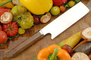 The nakiri is a multipurpose chef's knife ideal for chopping fruits, vegetables, and boneless meats. The edge is double beveled, like a Western knife. Though sometimes called a vegetable cleaver, the thin edge geometry makes it a precision tool, rather than a Japanese equivalent to meat cleavers. Nakiri make fast, accurate work of thin slicing and chopping.