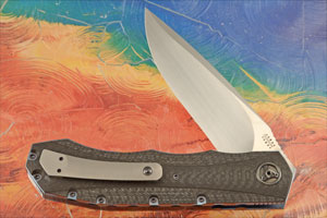 Handle scales are microtextured carbon fiber. The custom heat colored zirconium pivot and collar complement the scales nicely. Jimping on the thumb ramp aids grip. The flipper doubles as a guard that keeps your hand from sliding forward onto the blade. The gently rounded and 3D contoured handle feels sturdy and fills your hand perfectly. It is completed with anodized, fileworked titanium liners that elegantly contrast against the scales and carbon fiber backspacer. The 3D machined titanium pocket clip is mounted for left-side, tip-up carry and features a ceramic ball for excellent pocket retention.