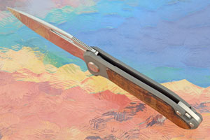 A glass bead blasted grade 5 titanium frame ensures this mid-size folder will be light in the pocket, yet have tremendous strength and durability. Each side features a presentation grade Arizona desert ironwood (Olneya tesota) inlay. The ironwood has a nice mix of light and dark warm tones. Screws throughout were made in the Arno Bernard workshop and are grade 4 titanium, allowing them to be anodized. Ensuring rigid, yet light construction, the backspacer is grade 5 titanium.