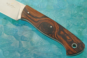 Hand contoured Arizona desert ironwood handle scales are set on the distal tapered full tang, ensuring a perfect balance. Desert ironwood (Olneya tesota) is a rare wood that is only found in the valleys of the Sonoran Desert below 2,500 foot elevation. It is extremely dense and durable. In fact, it is so dense, that if a piece is dropped in water it will sink! Black and white liners assist the handle to adjust to temperature and humidity changes. A lanyard can easily be added to the back of the handle. This knife will be incredibly high performance with very low maintenance requirements!
