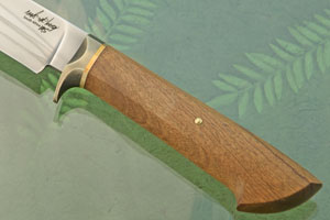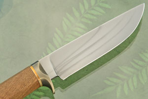The drop point blade is hand forged W2 carbon steel with a differential heat treatment separating the ultra-hard cutting edge from the soft and supportive spine. W2 carbon steel is highly revered for its ability to hold an excellent edge, coupled with good toughness and chip resistance. Neels' touchmark is engraved on the left side of the blade.