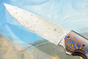 Handle scales are cream toned mammoth ivory set on blue anodized titanium liners. Timascus (titanium damascus) bolsters are dovetailed to the mammoth ivory scales. The titanium liners surround a free floating Damasteel stainless damascus backbar. The inside of the liners is engraved with Jason's touchmark and Model 56. The inside of the backbar is engraved with the steel used and the Rockwell hardness of the blade. A Timascus pocket clip is mounted for right-side, tip-up carry.