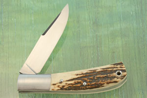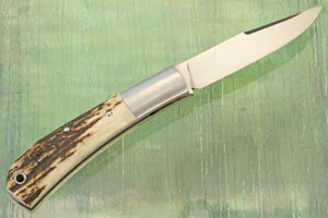 The handle is European stag secured to the stainless steel liners using hand domed pins. The scales are nicely dovetailed to satin finished stainless steel bolsters. A lanyard tube is included at the rear in case a lanyard is desired.