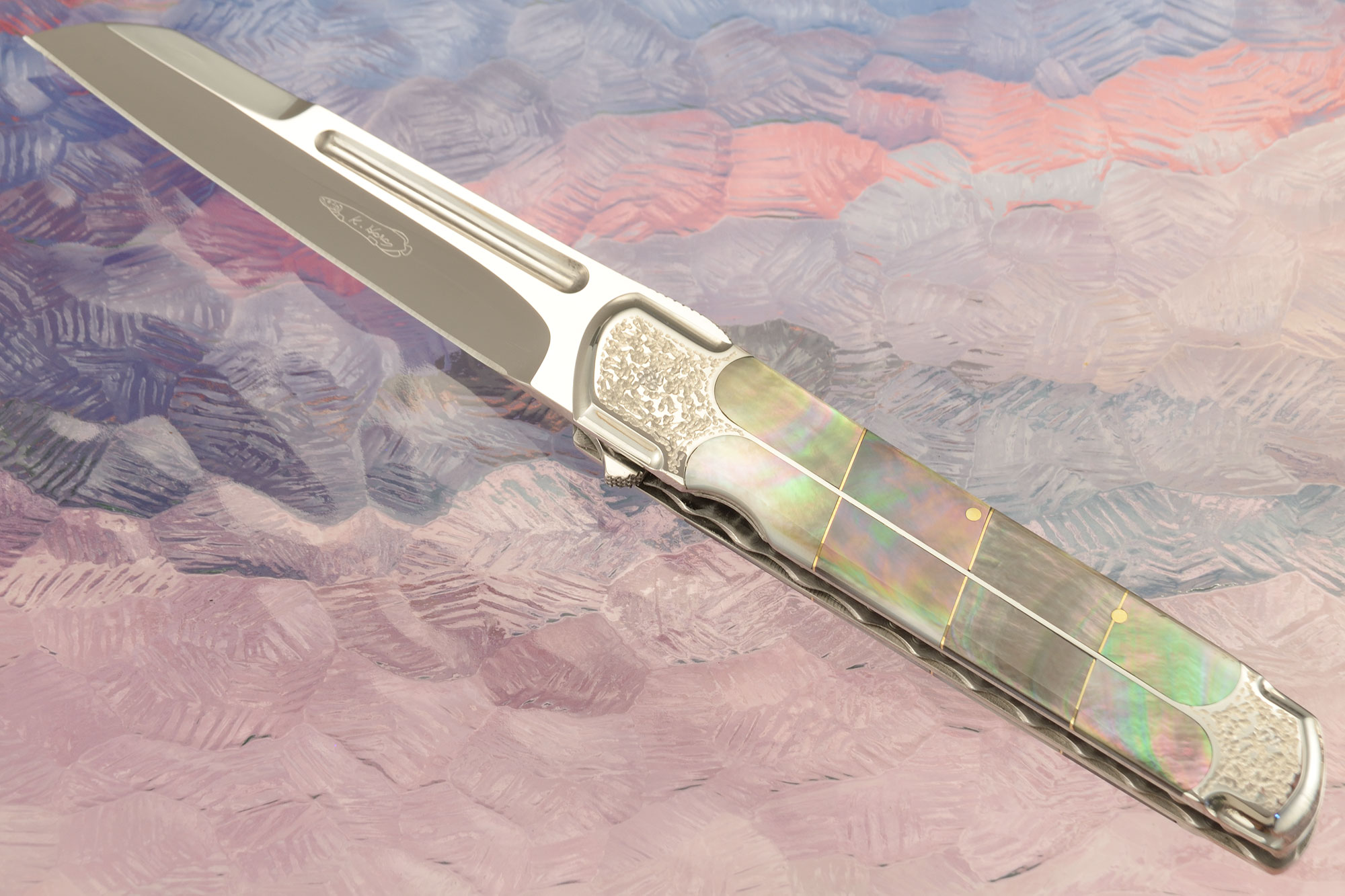 The 420 stainless steel handle features 8 individual inlays of blacklip mother of pearl on each side of the knife. Blacklip mother of pearl of this quality has become increasingly rare and hard to find. The pearl flashes the purples, greens, and blacks that make this pearl so desirable. Gold pins and spacers are used in the inlays. The front and rear sections of the 420 stainless steel frame are hand textured (tsuchime), providing the appearance of bolsters. The stainless steel liners are hand fileworked and textured to nicely match the frame. The fileworked and textured stainless steel backbar features four blacklip mother of pearl cabochon inlays.