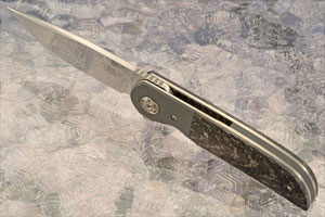 The handle scales are Silver Snakeskin FatCarbon. They are perfectly fit to blackened zirconium bolsters. Titanium liners surround a blackened zirconium backbar. The Rausch external pivot and pivot collar are brought to a high polish. The 3D machined titanium pocket clip is mounted for right-side, tip-up carry.