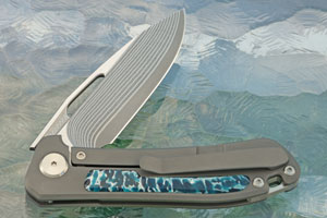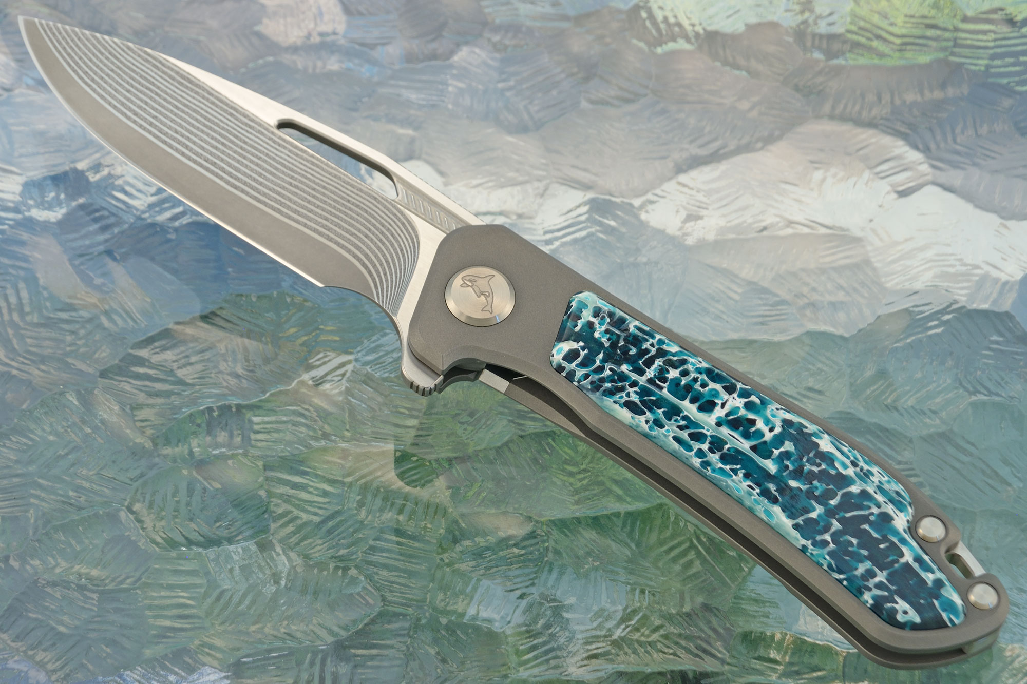 The blade effortlessly rotates on a Skiff-made caged ceramic ball bearings. If Skiff-made ceramic caged bearings weren’t enough, a house-made .020” tungsten disc is inserted into the titanium frame, ensuring a perfect racetrack for the bearings. The pivot barrel is 431 stainless steel, heat treated to 48 Hrc. The pivot is engraved with a detailed orca. The blade can easily be opened single handed using either the flipper tab or extended thumb notch. The blade has silky-smooth, drop-shut action, and is perfectly centered. Perfect lockup is ensured with a replaceable internal lock face. The lock face is hardened 17-4 PH stainless steel.