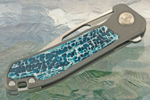 A glass bead blasted grade 5 titanium frame ensures this mid-size folder will be light in the pocket, yet have tremendous strength and durability. Each side features a green kudu horn inlay. Screws throughout were made in the Arno Bernard workshop and are grade 4 titanium, allowing them to be anodized. Ensuring rigid, yet light construction, the backspacer is grade 5 titanium.