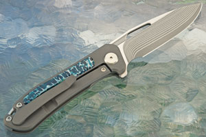 The blade is hand ground stainless damascus san mai. A central bar of Takefu SG2 powdered metallurgical stainless steel is surrounded by alternating layers of stainless steel and nickel. At Hrc 62-63, this folder has among the best edge holding of any Bernard knife ever made. The resulting damascus is high contrast and immediately captivating. The linear damascus reveals the complex, super-clean grind. The flats are satin finished, nearly hiding the pattern. The blade is hollow ground for an easy to maintain edge. Thumb ridges on the spine ensure a secure, comfortable grip.