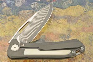 Product Description for Orca 2.0 Frame Lock Flipper with Warthog Tusk Inlay - SG2 San Mai Damascus - Serial 284