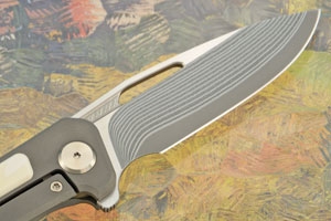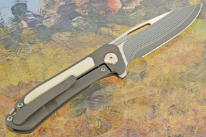 A glass bead blasted grade 5 titanium frame ensures this mid-size folder will be light in the pocket, yet have tremendous strength and durability. Each side features a warthog tusk inlay. Screws throughout were made in the Arno Bernard workshop and are grade 4 titanium, allowing them to be anodized. Ensuring rigid, yet light construction, the backspacer is grade 5 titanium.