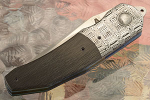 Handle scales are Blackwood carbon fiber. Jimping on the thumb ramp aids grip. The gently rounded handle feels sturdy and fills the hand perfectly. Anodized titanium liners surround a carbon fiber backbar. The scales are fit perfectly to stainless damascus bolsters forged by Damasteel in Sweden. The bolsters are nicely complemented by the matching stainless damascus pivot and collars. The heat colored zirconium pocket clip is mounted for right-side, tip-up carry.