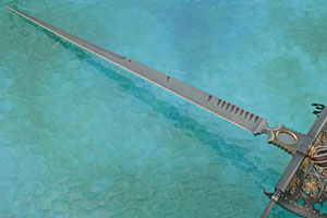 The handle is presentation grade curly koa, fluted with fine silver twisted wire. Curly koa (Acacia koa) is only found on the Hawaiian Islands and is one of the most desirable exotic woods used in knifemaking due to its gorgeous curly figure and high chatoyancy. The handle meets perfectly with fluted bronze spacers and the engraved pommel. The forged basket is mild steel that has been carved and pierced with decoration. This painstaking process is extremely time consuming and must be done to perfection. Bronze crosses and brass pins decorate the basket. The pommel can be twisted, which allows the knife to be disassembled if cleaning or maintenance is needed. Take-down construction requires tighter tolerances and shows Neel's focus on the details.
