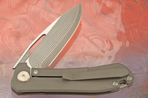 The blade effortlessly rotates on a Skiff-made caged ceramic ball bearings. If Skiff-made ceramic caged bearings weren’t enough, a house-made .020” tungsten disc is inserted into the titanium frame, ensuring a perfect racetrack for the bearings. The pivot barrel is 431 stainless steel, heat treated to 48 Hrc. The pivot is engraved with a detailed orca. The blade can easily be opened single handed using either the flipper tab or extended thumb notch. The blade has silky-smooth, drop-shut action, and is perfectly centered. Perfect lockup is ensured with a replaceable internal lock face. The lock face is hardened 17-4 PH stainless steel.
