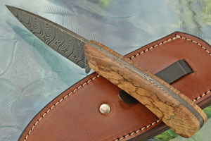 Spalted oak scales are set on the full tang for strength and durability. The corners are chamfered to prevent hot spots in hand. At only 3 ounces, this knife is so light you won't notice it until it is needed.