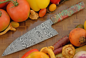 The ambidextrous Japanese-inspired handle is dyed and stabilized box elder burl. This wood is particularly dramatic and has a swirling, convoluted figure. This nimble knife is perfectly balanced: once you use it, you won't want to put it down.