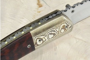 Description: It is a pleasure to pick up Jeff Hall's knives. The fit and finish is always spectacular, whether you look at the fit between the bolsters and scales, or the well centered blade. The action is superb. The stainless steel blade has been fileworked, leading into the fileworked titanium spacer. The liners are gold anodized titanium, matching the brass of Mike Sakmar's mokume.