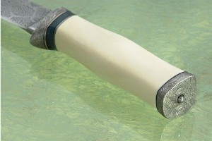 Description: This is one of the masterpieces of James' career to date. The fit and finish, from the Damascus guard and butt cap to the grind lines is excellent. The reconstituted deep green turquoise spacer is surrounded by black and nickel spacer material and will allow the natural handle materials to expand and contract in different temperature ranges. The skill shown in creating the detailed Damascus pattern used throughout this knife is inspiring. Persian ribbons run through detailed cross pattern mosaic Damascus with seemingly endless detail and perfect control. The ivory handle swells at the palm creating a perfect feel in the hand. A Damascus guard and butt cap brings the weight approximately one inch behind the guard so that the knife sits squarely in the hand for ultimate control.