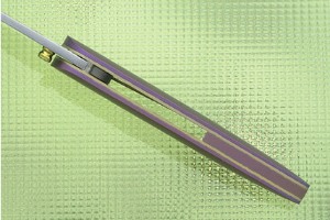 Description: Gary's knives are precision incarnate. Titanium construction keeps this folder light and fast in the hand. Anodized titanium scales are laid upon 6AL 4V gold anodized titanium liners. The partial back bar is purple anodized titanium. The single sided thumb bob is knurled, gold anodized 6AL 4V titanium. The action is silky and the blade well centered.