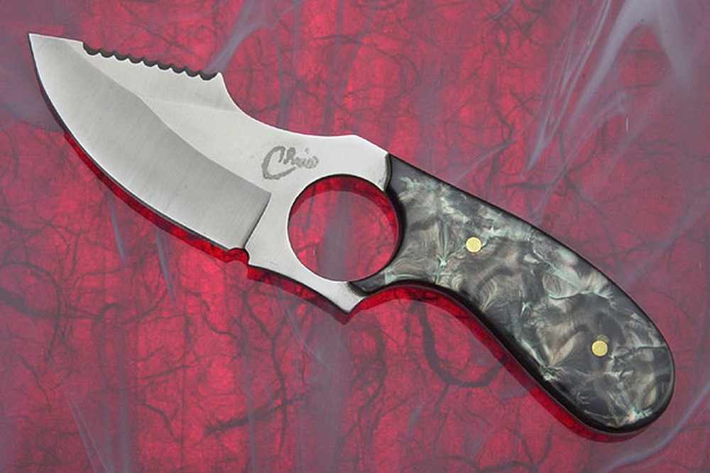 Description: The blade of this knife made by Christopher Scott, Audra's 13 year old son, was purchased from Texas Knifemakers Supply and is made from high quality stainless steel that will have good edge holding ability. It has been deep cryogenically heat treated for exceptional edge retention. The synthetic pearl holds up well. The false edge has been serrated, making this a very practical knife to have at hand. A real collector piece showing the promise from one of the younger members of Audra and Mike Draper's family!