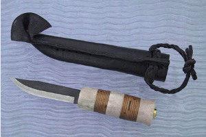 Description: Shawn's work is very exciting. His style and materials are true to his Nordic heritage. The fit and finish are excellent. The blade seats securely into a dense crown piece of deer antler. Alternating deer antler and birch bark gives tremendous interest to the handle, as well as allowing the piece to expand and contract with environmental changes. The tang goes straight through the center of the handle and is secured with a decorative brass pin in the butt section.