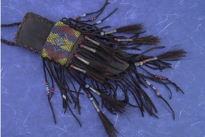 Sheath: Beaded rawhide sheath with tin cones and horse hair decoration by Karen Shook