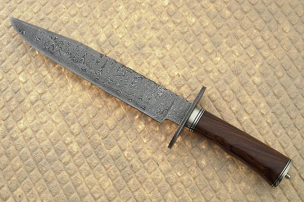 Description: This classic American Bowie shows the height of art. The Damascus is very bold and shows off well from a distance. The blade has been distal tapered to bring the weight back and is centered approximately 1/2" in front of the Damascus guard. The spine has been elegantly vine-pattern fileworked. The temper line on the blade shows that Bob has created this Bowie with a differential heat treat, whereby the spine has been softened for durability, but the edge is hardened for edge retention. The result is a blade that both holds its edge, and is super-sturdy. The English walnut handle is created from a single piece of wood and has been lightly sculpted to comfortably fit the hand in a large number of holds. Great fit and finish throughout. Comes with certificate from the maker.