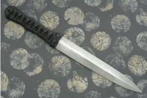 Description: The black ray skin creates a stealthy look to this 9" Japanese influenced dagger. The resin impregnated wrap and ray skin create an excellent grip in the hand. The hamon is the result of the traditional Japanese method of clay tempering which retains the resilience of the spine while hardening the edges for superior sharpness. Steve's knives are well tested in the field and are extremely well executed.