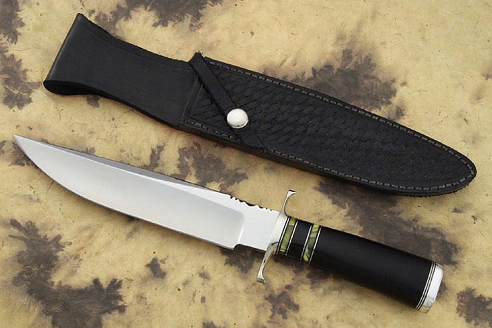 Description: Jim Buchan has created a dramatic Bowie using time-tested designs. The dark black ebony handle is well offset by alternating amber and buffalo horn spacers. The stainless steel guard and butt cap create a perfect balance in the hand. By mirror polishing the flats of the blade and satin finishing the grinds, Jim accentuates the dramatic grind lines. The blade has been heat treated to Rc 57/58 for optimal edge retention. Comes with certificate from the maker.