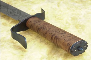 Description: Mastersmith Ed Caffrey creates an amazing Bowie with large proportions that immediately grab attention. This is one of those pieces that I find myself picking up repeatedly throughout the day. The feel in your hand is amazing. The balance point is right at the end of the choil. The mild blue steel guard sets off the thuya burl handle. Spectacular Damascus with great edge holding ability.