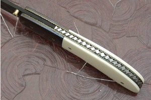 Description: Dramatic is the word that comes to mind to describe this knife. Pure white pre-ban elephant ivory scales are perfectly met to heat colored Timascus bolsters. The heat colored Timascus bolsters pick up the blue tones of the cut sapphire set in a 14k gold thumb stud. The bolsters and scales are set on fully fileworked, anodized titanium liners with a jeweled polish on the interior. The backbar is 416 stainless steel and has been fully fileworked both inside and out. 24k gold plated fasteners are used throughout. Well centered grind lines and blade. Smooth action. Excellent fit and finish throughout.
