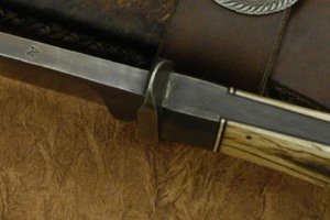 This large Cowboy Style Bowie was forged from 5160 carbon steel and has an antiqued finish. The flats have been hammer finished. Elk antler scales sit on the distal tapered tang. They have been burnt for an antique appearance. This knife is, of course, accompanied by a sheath by Karen Shook. She has combined latigo leather and rawhide for a true period feel.
