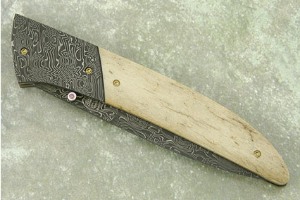 Description: Art Washburn creates a very slick folder -- equally at home in the collection or carried as a prized knife. Mammoth bone scales are dovetailed to Devin Thomas stainless Damascus bolsters. Black fiber spacers allow the knife to adjust to temperature and humidity changes. The scales are set on bronze anodized titanium liners. Arthur's eye for detail led him to carry Devin Thomas' "Fireball" pattern Damascus from the blade into the fileworked backbar. Butter smooth action. Excellent fit and finish throughout.
